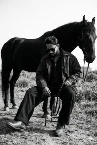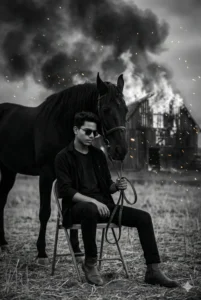 Create a cinematic black-and-white fashion portrait of a confident young man seated on a metal chair in an open rural field. He is styled in an open black shirt layered over dark attire, paired with black trousers, leather boots, and dark sunglasses. Horse reins rest loosely in his hand, while his head tilts slightly downward, conveying calm strength and fearless composure.