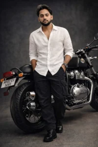 He is dressed in a white open-collar linen shirt, black baggy cargo pants, and polished footwear, styled naturally for a modern, confident look.