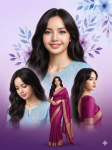 • Realistic saree fabric folds and flow