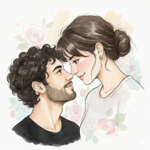 Create a romantic watercolor-style digital illustration featuring an intimate close-up of a young couple.