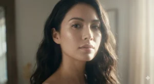 Add a subtle lens bloom and a thin atmospheric glow layer around the face and shoulders for a dreamy, elevated feel. Skin tones should appear smooth and radiant with gentle tonal transitions, without over-smoothing or artificial shine.