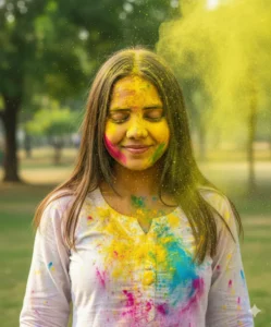 - Words jaise: color splash, vibrant powder, joyful atmosphere use karein