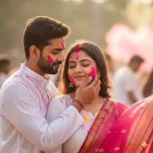 Romantic, joyful, intimate Holi celebration โ authentic, warm, and emotionally real.