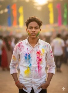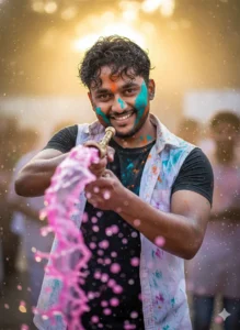 Agar prompt properly likha ho, to output ek vibrant festival poster ya cinematic Holi frame jaisa lagta hai