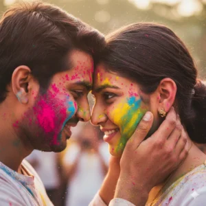 Romantic, warm, festive, and emotionally intimate Holi moment โ authentic, joyful, and deeply connected.