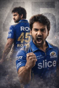 Create a cinematic dual-pose cricket poster in ultra-realistic 8K quality, featuring a young man in a Mumbai Indians (MI) kit.