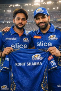 Both me and Rohit Sharma are wearing Mumbai Indians team jerseys, with accurate colors, logos, and details.