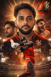 Create an ultra-realistic 8K cinematic sports poster featuring a young Indian cricketer in his Royal Challengers Bengaluru (RCB) IPL persona.