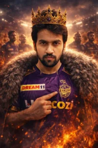• Underneath, wearing the purple and gold KKR jersey with visible sponsor details like “Dream11” and “Lux Cozi”