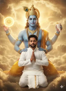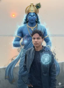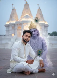 Create a cinematic, emotionally powerful devotional frame featuring me and Lord Krishna together in one scene.