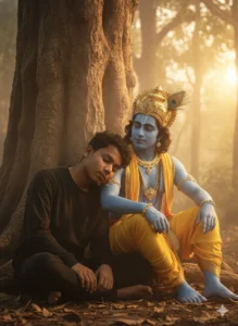 I am seated beside Lord Krishna under a large ancient tree in a tranquil forest at dusk.