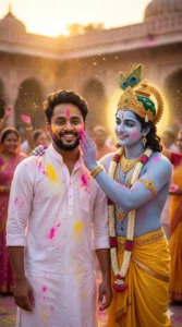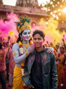 A subtle, soft golden aura surrounds him โ gentle and natural, not exaggerated. Lord Krishna is gently applying bright pink gulal to my cheek with a serene, affectionate smile, capturing a spiritual yet joyful Holi moment. The interaction should feel warm, respectful, and emotionally devotional.