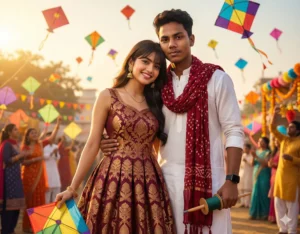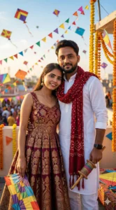 Both subjects look directly at the camera with soft, romantic expressions. The background is filled with flying kites, festive decorations, and warm golden sunlight, creating a vibrant, joyful, and celebratory Makar Sankranti atmosphere.