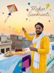 Add elegant sky text reading “Makar Sankranti”, seamlessly blended into the scene.