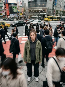 Set at Shibuya Crossing, surrounded by a dense urban crowd.