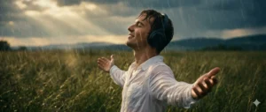 Create a hyper-realistic, cinematic side-profile portrait of a young man standing in a lush green field during rainfall. He is dressed in a white shirt, wearing over-ear headphones. His eyes are closed, head tilted slightly upward as if taking a deep breath, with arms relaxed and gently open, conveying calm release.