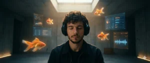 The setting is a dark, minimal, futuristic interior space. Around him float subtle levitating UI panels and glowing orange goldfish, arranged in a balanced, surreal composition.