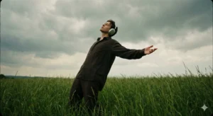 He wears large, silver over-ear headphones, reinforcing the feeling of being immersed in music. The camera angle is slightly low, adding subtle intensity and cinematic presence to the composition.