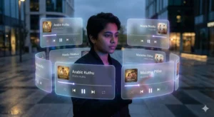 Create a surreal, film-quality augmented-reality visual where multiple floating music-player interface cards orbit around the central subject (the person shown), forming a fully realized 3D spatial composition. Each floating card represents a Tamil song and is placed at different depth levels—some positioned prominently in the foreground with partial overlap on the subject, while others drift subtly behind and along the sides to enhance immersive depth.