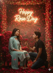 In the background, glowing neon text reads “Happy Rose Day” in yellow and red lighting, creating a bold romantic contrast.