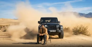 Use the provided reference image to produce a highly realistic, cinematic desert sequence. At the opening of the shot, the man is seated calmly on a folding chair, holding his right hand slightly raised in a relaxed manner. As a vehicle begins to appear from behind a broad sand dune, he slowly lowers his hand with smooth, natural motion and rests it on his lap, maintaining a confident, composed posture throughout the movement.