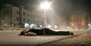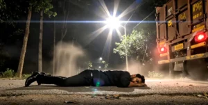End Shot: The truck continues forward and exits the frame to the right. The camera holds on the motionless figure beneath the harsh streetlight. Cold night tones, gritty realism, and an authentic Indian street atmosphere dominate the final frame—cinematic, restrained, and physically believable.
