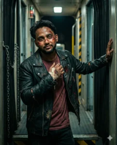 Create an ultra-realistic 8K cinematic photograph in portrait format (1664 × 2080), maintaining the same raw Indian train realism as before, but with a completely new pose and a clearly different background position.