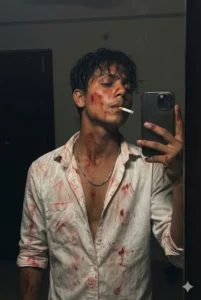 His face, neck, chest, and arms show realistic red stains and smudges, textured naturally and blended convincingly into the skin and fabric. He is wearing a silver chain necklace, and a cigarette rests at his lips, giving a gritty, moody attitude.
