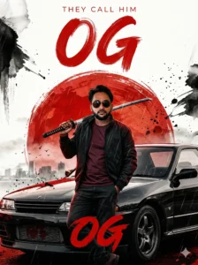 The movie title “OG” appears in bold, hand-painted red brushstroke lettering, matching the visual style used on the front of the vintage black car. Above it, the tagline “They Call Him” appears in smaller, minimal text, maintaining a clean cinematic hierarchy.